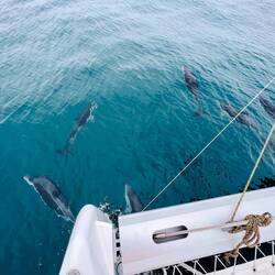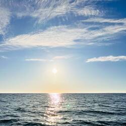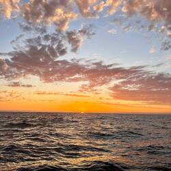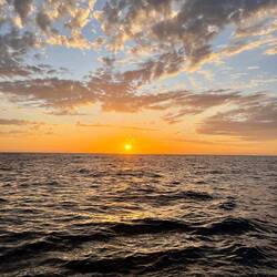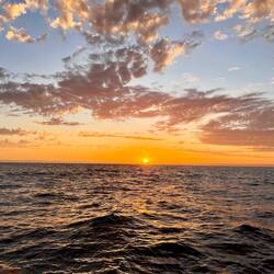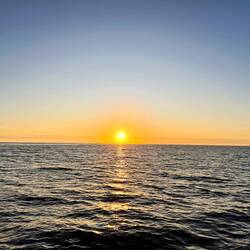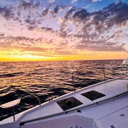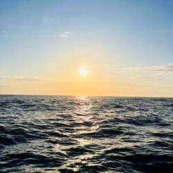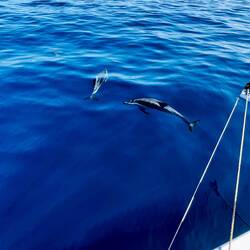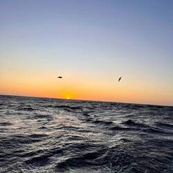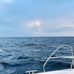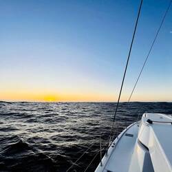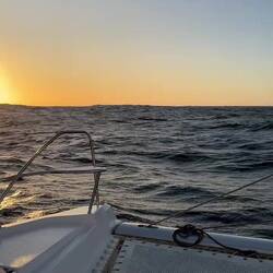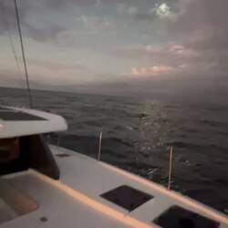 Am Abend hatten wir einen wunderschönen Sonnenuntergang und ich habe ein paar Fotos gemacht, am Bug die Wellen genossen und gejubelt, hihi, und mit nassen Schuhen dafür bezahlt. Als ich das Video aufnahm, Backbord der Mond und Steuerbord der Sonnenuntergang, haben sich doch tatsächlich die zwei Delfine in den Film geschmuggelt und waren auch gleich wieder weg. Wahnsinn. Es gibt viele unfassbar kleine wundervolle Momente, die mich aus ganzem Herzen lächeln lassen…. ⛵️