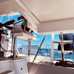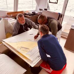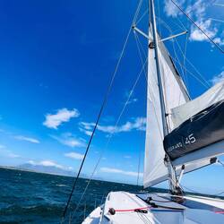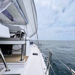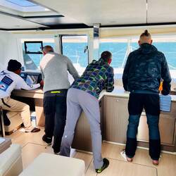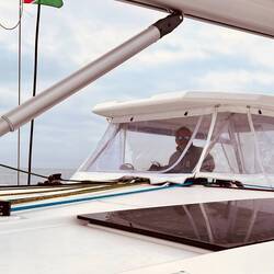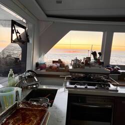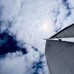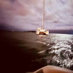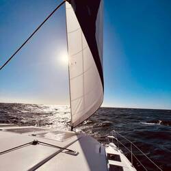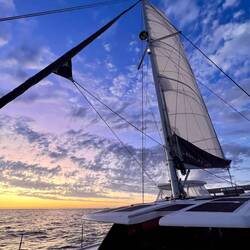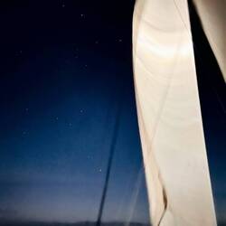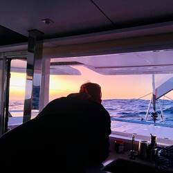 21:27 Uhr Ich habe Nachtwache bis 23 Uhr. Collin&Thomas haben das MainSail geborgen, was im Dunkeln immer eine sehr spektakuläre Angelegenheit ist für mich, da der Katamaran vorher in die richtige Position gebracht werden muss. Er muss in den Wind gestellt werden und ich, ich sehe mich dann in einer kleinen Nussschale sitzend, gefühlt umgeben von Sturm und Monsterwellen.
