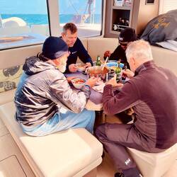 16:00 Uhr ..ich habe gerade das Gefühl, so aufregend muss sich eine Weltreise anfühlen.. Wir waren ausklarieren, ich musste erst einmal das Wort googeln, und sitzen jetzt, 4 Stunden später, ausklarieren dauert so lange, und gönnen uns Wasser, die Männer Bier, im SeefoodRestaurant an der V&AWaterfront. ..mir war wohl schon bewusst, dass wir für ein Abendessen keine Zeit haben werden, bestellte extra viel und lies mir den Rest einpacken.. 😉 Wir mussten noch in den Supermarkt, die Männer wollten alle noch ne dicke JoggingHose shoppen und Ralf brauchte noch AirPods. Die AirPods hätte ich sogar spendiert, in der Hoffnung, ich muss auf dem Meer keine Musik ertragen. 🤪 (Ralf ist nervös, es fallen mir spontan 100 weitere Worte ein 🫣, er hat sogar vorhin das erste Mal „ich soll euch liebe Grüße von meiner MAMA bestellen“ gesagt, nicht Mutter, MAMA. Tante Renate hat beim lesen bestimmt Tränen in den Augen und lacht.)