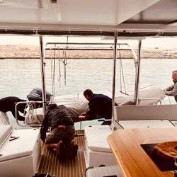 Um 9:24 Uhr wurden die Leinen losgemacht, weil wir umparken mussten für kleine Schweißarbeiten, Thomas checkte die Ausreisemodalitäten, das Dingi wurde das erste Mal zu Wasser gelassen und gecheckt und der IT-Fachmann sollte das AIS einrichten, was jedoch leider nicht abgehakt werden konnte, weil vermutlich unsere Antenne nicht angeschlossen ist. Weiterhin fehlen uns noch die ExportPapiere vom Hersteller, die sind jedoch in Arbeit. Das ist jetzt mal gleich die To-do-Liste für morgen, jedenfalls n 1/4 davon. 🫣