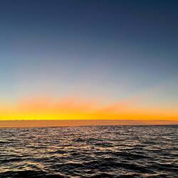 In der orangen Dämmerung, es ist noch dunkel, tauchen wir immer wieder in der Dünung ein, dann sehen wir den Horizont nicht mehr, als wollte die Welle, besser die Dünung, uns verschlucken.