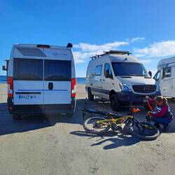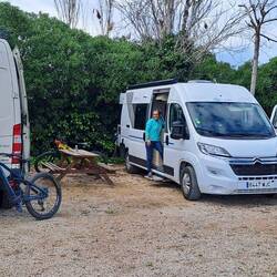 Es ist sehr voll mit Womos aber wir haben noch ein kleines Plätzchen für uns gefunden.