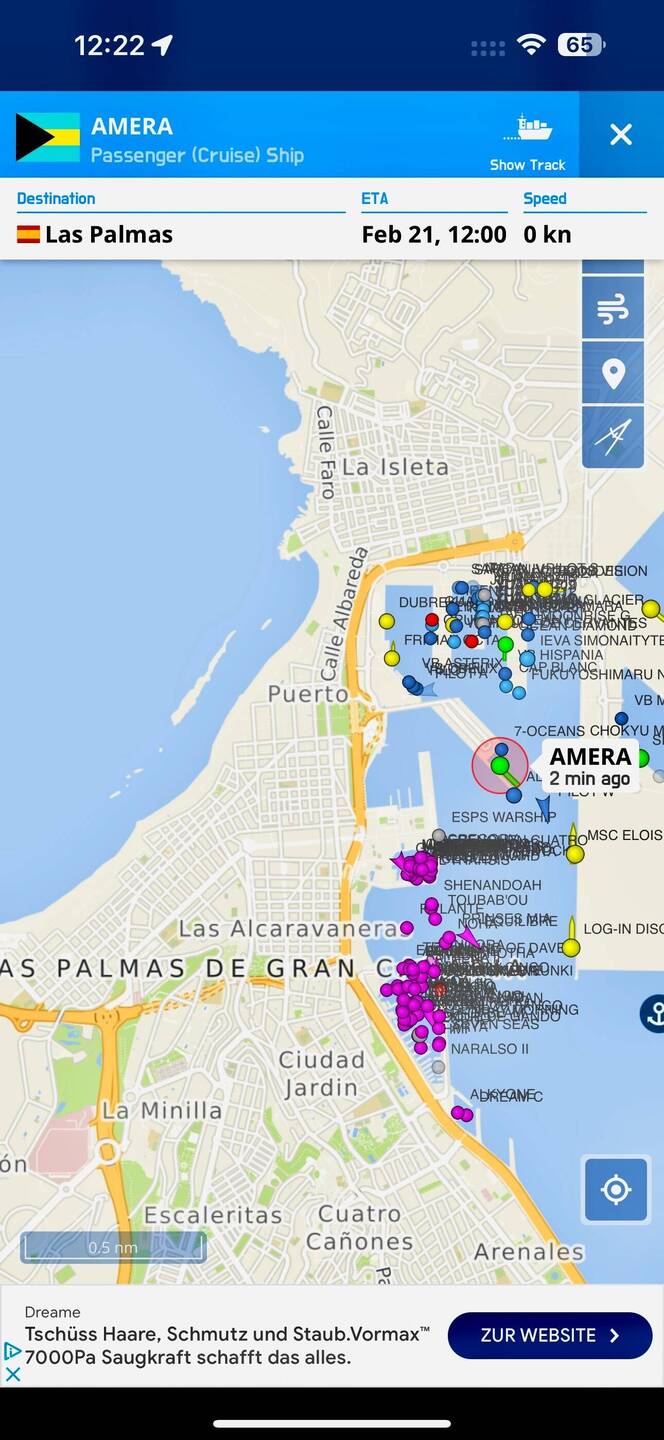 Heute ist die Sahara Staubwolke immernoch da, etwas weniger kompakt. Temperatur nur noch etwa 22 Grad. Dünung etwa 3-4 Meter - zum Teil heftige Windböen 💨.