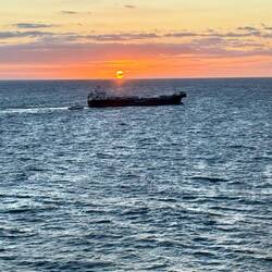 Heute Morgen schöner Sonnenaufgang über einem Schiff in der Einfahrt zu Montevideo Uruguay bei strahlendstem Wetter bei angenehmen 23 Grad. Pünktlich in Montevideo angelegt. Bin vormittags zu FussLeggi altro