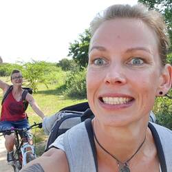 Seine Frau schwang sich elegant mit aufs Moped und die beiden fuhren langsam voran, während wir ihnen mit unseren Rädern hinterher strampelten. Im Dorf alles kein Problen aber dann kamen wir auf die Hauptstraßen und hatten noch gut 12km Fahrt vor uns. Es war jetzt etwa 12 Uhr mittags, die Sonne brannte uns Löcher in die Klamotten, wir trieften vor Schweiß und strampelten uns in der leicht hügeligen Landschaft direkt ins Nirvana. Ich denke ich brauche nicht weiter zu erwähnen, dass wir froh waren auf der, dank einiger Bäume, Schattenseite der Straße zu fahren. Am Hotel angekommen, bedankten wir uns bei unserem Guide und verabredeten eine Zeit wann wir zum Flughafen in 2 Tagen abgeholt werden.