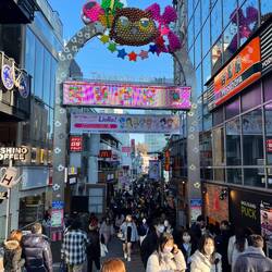 Today, our third day in Tokyo, was a big day of exploring Tokyo. We met Junko in Harajuku to wander through Yoyogi park. Today, there was a flea market, which had lots of second hand clothes. We had a quick look through there, before heading over to Takeshita Street. This street is famous for its quirky clothes, toys and food. Alex and I tried crepes from the famous Marion Crepes, which is the original Crepe shop of Harajuku. We had Gyoza for lunch before heading over to see the Shinjuku crossing.