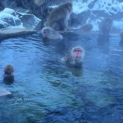 We boarded a 3.5 hour bus trip out to Nanagano and then another hour on the train which got us to a small town called Yudanaka. It was cold and snowing when we got there, but we stayed in a traditional Japanese Ryokan (guesthouse). It was warm and cosy and we had hot tea waiting for us on arrival. That afternoon we visited the private Onsen in the hotel. It was an indoor onsen and very small, just big enough for Alex and I to fit into.