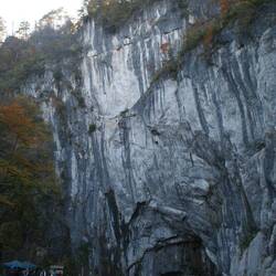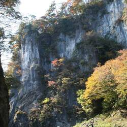 Taxis returned us to Geibikei where we ate our snack lunches besides the Satetsu River before boarding a punt to take us into the Geibikei Gorge There were beautiful autumn colours on the 120m cliffs. We saw a black kite, cormorants, and carp. The boatman sang a local song in the otherwise peaceful surroundings.