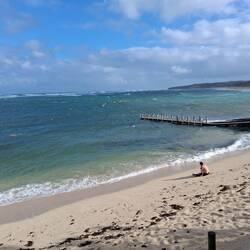 On a windy day with sun and showers, we checked out of the motel in Margaret River and drove to the popular White Elephant Cafe at Gnarabup Beach for breakfast and then to Surfers Point where the World Surfing Championships had been held recently at Prevelly Beach with an Aussie lady winning a Gold Medal.