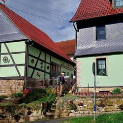 Alpakas, ein bissiger Ganter, Schafe mit jungen Lämmern, die sich um und auf dem Muttertier lagerten, ein Esel im Köhlerdorf Meusebach, deren Bewohner nicht weniger störrisch waren als das Tier,もっと詳しく