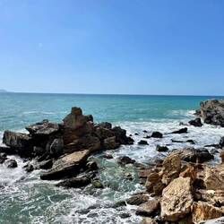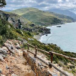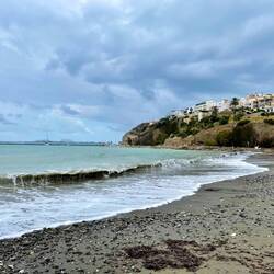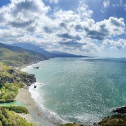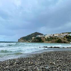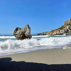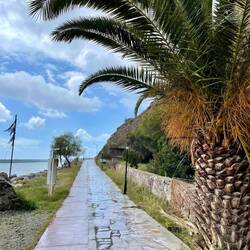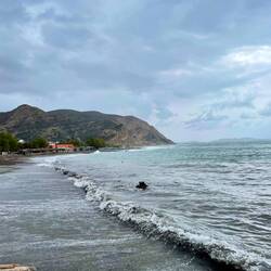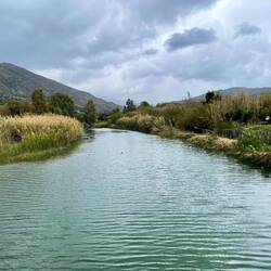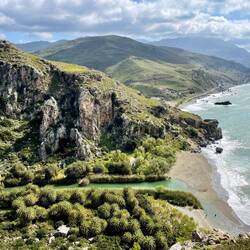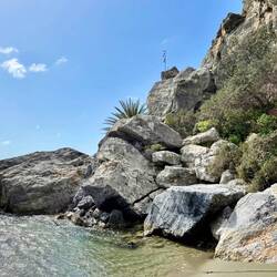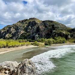 Wir sind von Agia Galini die Küste entlang bis zu einer Brücke aus Metall über einen Fluss, welcher direkt ins Meer fließt. Auf dem Weg zur Brücke war es noch trocken, auf dem Weg zurück hat esLeia mais
