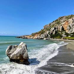 Am Strand angekommen durften wir die schwierigste Hürde überwinden. Der Fluss aus der Preveli Schlucht fließt einmal quer über den Strand und ins Meer. Um vom kleineren Teil des Strandes zumLeia mais