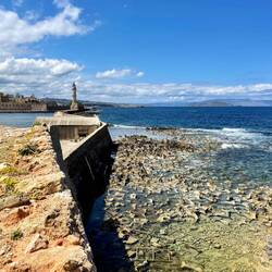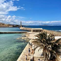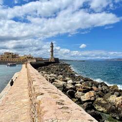 Am Hafenbecken entlang ging’s vorbei an den sehr imposanten alten Schiffswerften zum Wellenbrecher von Chania. Auf dem Wellenbrecher kann man sehr angenehm spazieren und kommt dabei problemlos bisLæs mere