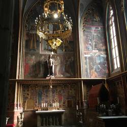 Der Veitsdom ist einfach nur unglaublich imposant. Diese immense Größe, mitten in einem Burghof. Sowohl der Dom selbst, als auch die riesigen Türme. Einfach nur wow! Der Veitsdom, auch St.-Veits-Dom genannt, die Kathedrale des Erzbistums Prag und das größte Kirchengebäude Tschechiens. Sie wurde unter Kronprinz Karl, dem späteren Karl IV., ab 1344 erst von dem französischen Architekten Matthias von Arras und dann vor allem durch den deutschen Baumeister Peter Parler nach Vorbild der französischen Königskathedralen errichtet. Der Dom ist Teil des Welterbes Historisches Zentrum von Prag. Mit dem Bau des heutigen Gebäudes wurde am 21. November 1344 begonnen. Der mächtige, dreischiffige Dom wurde im Stil der Gotik erbaut. Die Länge des Hauptschiffs beträgt 124 Meter und die Breite des Querschiffs 60 Meter. Die Höhe im Inneren beträgt 33 Meter und der Hauptturm ist 99 Meter hoch. Um den Dom zu betreten, mussten wir uns anstellen. Zum Glück ging das jedoch relativ schnell und nach ca. 5 Minuten konnten wir das wunderschöne und leider sehr überfüllte Gotteshaus betreten.Read more