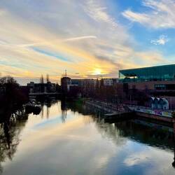 Vom wunderschönen Viertel ging’s dann bei sehr schönem Abendrot und untergehender Sonne vorbei am Hotel (und kurz rein) Richtung Einkaufszentrum ‘‘Place des Halles‘‘, wo wir zu Abend essenEn savoir plus