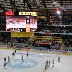Begrüsst wurden alle Fans direkt mit der, wahrscheinlich, standesgemässen Choreo vor dem Spiel. Das erste Drittel der Mutzen wurde der Kreativität der Fans gerecht. Körperlich überlegen, starke Checks, Offensivpower. Der SCB zeigte starke erste 20 Minuten. Dennoch waren die Gäste die ersten, die jubeln durften. Dies nach einer fragwürdigen Entscheidung des Unparteiischen, die vom Publikum mit lautstarken Pfiffen und diversen Behauptungen über das Sexualleben dessen Mutter, bewertet wurde.