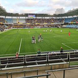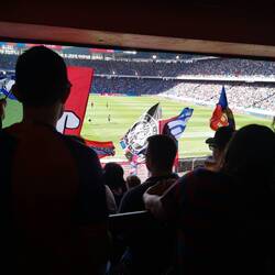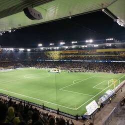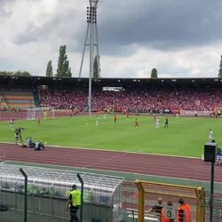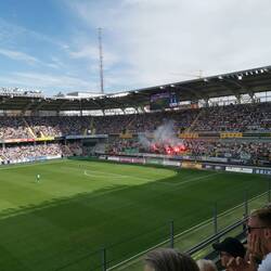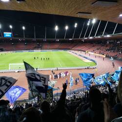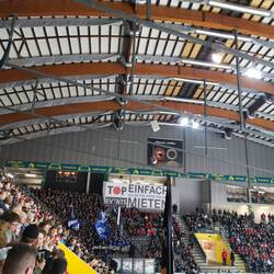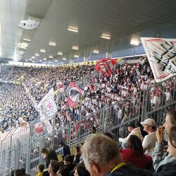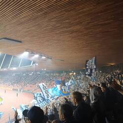 Gepäck abgegeben, zwei Bier geholt und auf zu Vincent und Markus in der Heimkurve. Der Heimsektor war bis aufs Maximum gefüllt und wir mussten uns mit den obersten Plätzen mit begrenzter Sicht zufrieden geben.
