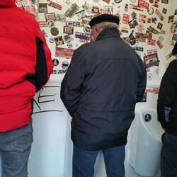 Da Markus aus dem weit entfernten Finnland angereist ist, wollte er unbedingt Sticker vom örtlichen Verein mitnehmen. Beim Gespräch mit den Ultras empfing er eine Welle von Sympathie und Aufklebern. Vincent und er sollte später noch mit dem Kern der Langnauer Fanszene feiern.