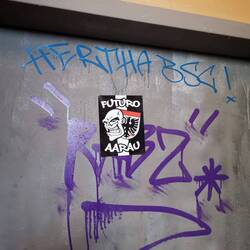 Empfangen wurden wir mit ausgiebiger Darstellung Badener Kunstkultur in Form von Graffitis. Vornehmlich beschränkten sich die Gäste auf die Schriftzüge "FC Baden" oder einfach nur "FCB". Später sollte sich zeigen, dass das Gezeigte auf dem Rasen ebenbürtig mit den rhetorischen Fähigkeiten der Anhänger der Bäderstadt ist.