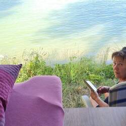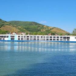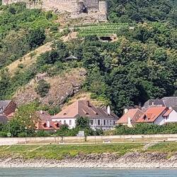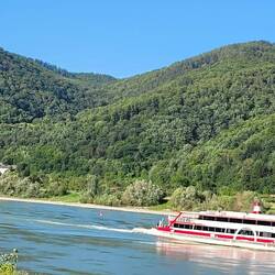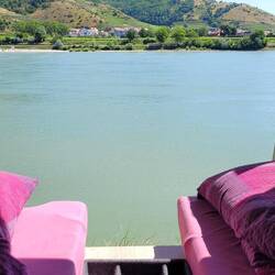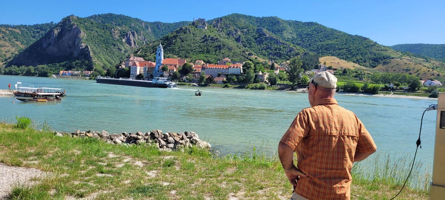 Nach einer Nacht auf dem Stellplatz, jetzt auf dem Camping Rossatz. Mit der Fähre ans linke Ufer nach Dürnstein. Wunderschöner Platz haben wir erwischt. Von meinem Bett aus die Flusskreuzfahrtschiffe.
