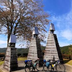 Nearby stood the 杉原千畝 (Sugihara Chiune) Memorial, three pyramidal structures each holding a bell—one for charity, one for spirit, and one for courage. Sugihara, a native of Gifu, was a Japanese diplomat stationed in Lithuania during World War II. Against orders, he issued thousands of transit visas that allowed Jewish refugees to escape Nazi persecution, saving as many as 6,000 lives. Today he is often called the “Japanese Schindler.” As we stood there, looking out over the valley we had just ridden through, we rang the bells quietly. It was a moment that blended the beauty of the land with the courage of a man who chose kindness in the face of immense risk.