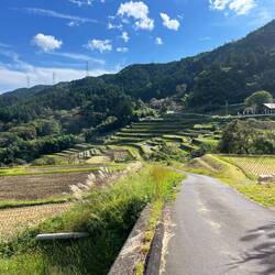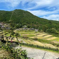 Our breakfast had been hearty enough that we skipped lunch, instead saving our energy for the viewpoint we had heard about. There, we unwrapped our leftover 枝豆 (edamame – green soybeans) and finished off a half-eaten bag of chips while gazing out over 棚田 (tanada – terraced rice fields). The patchwork of approaching autumn colored paddies stepping down the hillside felt like a living mosaic, each terrace offering a unique earth tone color. The valley stretched far below us, framed by mountains rising in gentle waves, their ridgelines soft in the haze. It was one of those moments when Japan shows her timeless side: human work and natural beauty woven together over centuries.