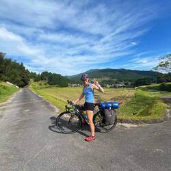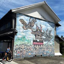 Knowing that we only had a short ride ahead (about 40 miles, with a few climbs to keep us honest), we allowed ourselves to enjoy a slow morning. Out of our hotel window we could see a 城 (shiro – castle), a 神社 (jinja – shrine), and the 若い太陽の塔 (Wakai Taiyō-no-tō – Tower of the Young Sun), a strikingly modern tower with bold lines and a futuristic design. The real highlight of the morning, though, was a FaceTime call with Sebastian and MK—hearing their voices and seeing their smiles gave us an extra boost for the day.