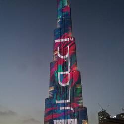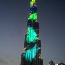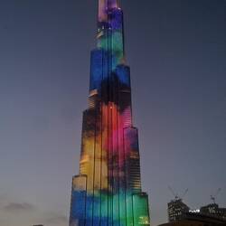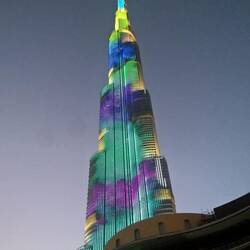 Der Burj Khalifa ist mit 828m das höchste Gebäude der Welt. Die Bauarbeiten begannen im Jahr 2004 und wurden bereits 2009 abgeschlossen. Am Abend wird der Turm in allen Farben beleuchtet.
