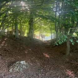 Danach began die Suche nach dem Weg. Es gab ihn nicht. Ich bin trotzdem durchs Gestrüpp wo er sein sollte und es hat so lange gedauert und tat wieder derbe weh. Lustig war dann, dass ich nach den 30 Metern für die ich ca. 30 Minuten gebraucht hab, auf einer unbefestigten Straße stand. Diese endete hier an einem Stall. Auch lustig war, dass ich dann begann aus dieser Sackgasse zu klettern und oben fand ich an den Bäumen Wanderwegsmarkierungen 😄