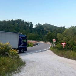 Somit war es heute sehr viel Straße und wieder so oft Lebensgefahr. Kein randstreifen. Müll und Bewuchs verengen die Fahrspur, ich mittendrin. Bei einer Situation innerorts, endeten auf beiden Seiten der Straße, sowie auf beiden Seiten der Brücke, die Bürgersteige und nur die Straße führte uneingeschränkt über die Brücke. Ich ging dem Verkehr entgegen, auch weil ich hinter der Brücke links musste. Aus dem Kreisverkehr kam ein LKW mit Sattelzug und beschleunigte was der Motor her gab. Es war 30 km/h. Er hupte! Ich sprang auf den gemauerten Brückensims und von dort dann auf den Bürgersteig. Er fuhr wirklich ungebremst weiter.