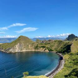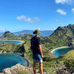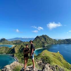 Schon nach den ersten Stufen konnten wir unseren Augen kaum glauben und wussten sofort: der Ausblick von oben wird unvergesslich! Mit jeder Etage wurde der Blick auf die 3 Buchten mit unterschiedlich farbigen Stränden (grau - durch Vulkangestein, rosa - durch Korallenreste und weiß) unbeschreiblicher ! Oben angekommen setzten wir uns einfach auf die Steine und starrten fasziniert auf die Landschaft. Wir saßen über eine Stunde am View-Point, aber auch beim Abstieg fühlte sich der Blick noch an wie im Film. Unten angekommen ging es weiter zum Pink Beach und der sollte unverhofft direkt zum nächsten Highlight werden. Wir legten mit dem Boot am Strand an und der war einfach wunderschön. Er leuchtet zwar nicht pink, aber der rosa Sand vor dem türkis farbigen Wasser und dahinter die Berge der Insel war schon wieder ein Postkartenanblick. Nach kurzer Zeit schnappten wir uns unsere Schnorchelsachen und es ging ins Wasser. Wir waren umgeben von unglaublichen Korallen und Fischschwärmen! Wir entdeckten einen Schildkröte, einen riiiieisgen Kugelfisch mit einem Kopf so groß wie mein eigener 😂, einen Blaupunktrochen und vieles mehr 🐠🐢. Die Vielfalt an Korallen faszinierte uns, sodass wir immer wieder den Kopf aus dem Wasser nahmen, um uns gegenseitig die schönsten Korallen zu zeigen 😂. Dabei sah Cedrik auf einmal in der Ferne eine Flosse und winkte mir zu - Delfine ! Sofort schwammen wir in die Richtung und konnten unseren Augen kaum glauben als uns anstelle des Delfins ein Manta Rochen, der so breit wie unser Boot war, entgegen kam 🤯!