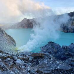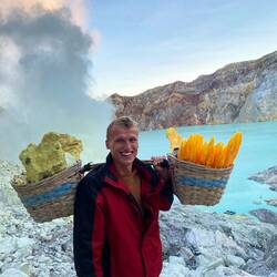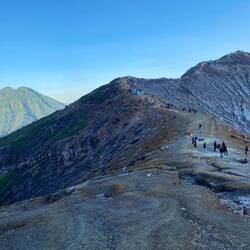 In der Hoffnung rechtzeitig im Krater zu sein, um vor Sonnenaufgang die blauen Flammen sehen zu können, klingelte unsere Wecker heute schon 2:20⏰ (am Abend gab es eine große Diskussion um jede Minute 😂). 2:45 Uhr sprangen wir auf den Roller und es ging ca. 40 Minuten durch die eiskalte Nacht 🥶. Am Nationalpark angekommen, kauften wir erstmal einen Tee, um uns wieder etwas aufzuwärmen. Der Nationalpark öffnet 4:00 Uhr, also machten wir uns nachdem wir den Tee getrunken hatten auf den Weg zum Eingang. Nach 5 Minuten etwas betteln und in der Kälte trampeln, ließ uns der Mann am Eingang 3:45 Uhr schon rein 🤩. Wir liefen den steilen Weg also so schnell wir konnten ! Vor uns lagen allerdings 3km bis zum Kraterrand auf 2.799m. Gegen 4:20 Uhr kamen wir also ziemlich kaputt oben an und fragten einen Mienenarbeiter, ob er uns das blaue Feuer zeigen könnte. Er antwortete uns, dass es dafür bereits zu spät sei, doch wir ließen uns nicht entmutigen und traten auf eigene Faust den Weg runter zum Krater an. Vor uns lagen weitere 15 Minuten steiniger Weg, bis wir endlich unten am Kratersee ankamen. Es war zwar noch ziemlich dunkel, doch es sah bereits unglaublich aus ! Auch die Arbeiter dort meinten, dass es bereits zu spät - also zu hell sei, um die blauen Flammen zu sehen, bis einer schrie: „Blue Flames ! Blue Flames !“. Es war nicht mehr ganz dunkel, doch wir konnten eine kleine Stelle mit diesem besonderen Naturschauspiel entdecken und waren überglücklich. 😍💙