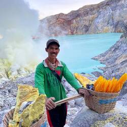 Anschließend beobachteten wir die Mienenarbeiter bei ihrer Arbeit, was beeindruckend und traurig zugleich war. Die austretenden Gase mit hoher Schwefelkonzentration werden in einem Rohrsystem zum Ufer des Säuresees geleitet, sodass der Schwefel aus den Gasen kondensiert und anschließend in großen Blöcken aus dem Gestein geschlagen werden kann. Anschließend wird er von den Arbeitern den gesamten Weg, den wir heute morgen zurück gelegt haben, in Körben transportiert 😒. Wir betrachten noch einmal den Säuresee und machten uns während des Sonnenaufgangs auf den Rückweg zum Kraterrand. Dabei kamen wir mit einem der Arbeiter ins Gespräch. Er erzählte uns, das sie gerade einmal 1.250 IDR ≈ 8 ct pro kg Schwefel bekommen. In ihren Körben, die sie auf den Schultern tragen, transportieren sie ca. 70kg 😳. Cedrik durfte versuchen diese Körbe zu tragen und konnte kaum glauben wie schwer sie sind ! Außerdem erfuhren wir, dass er seit 15 Jahren hier arbeitet und den Krater täglich 4x hoch und runter läuft, um Schwefel abzubauen. Wir waren wirklich betroffen und er freute sich sehr als wir ihm etwas Geld für die nette Unterhaltung gaben 😌. Am Kraterrand angekommen sahen wir die Umgebung das erste Mal im hellen und waren schon wieder einfach nur beeindruckt 😅. Die letzten Tage waren voller unvergesslicher Aussichten und doch wurden wir immer wieder neu beeindruckt ! Wir suchten uns ein windgeschütztes Plätzchen, aßen Kekse und Bananen und warteten bis der gesamte See in der Sonne lag, bevor wir den Rückweg antraten.