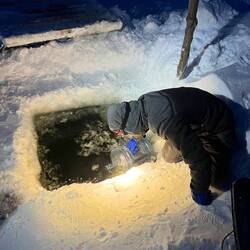 Zum Beispiel das Wasser holen. Da wir logischerweise so abgeschottet von Allem kein fließend Wasser haben, mussten wir uns unser Trinkwasser vom Fluss holen. Hierfür gingen wir mit einem Duzend Wasserkanistern zu der Eisstraße wo wir ein abgedecktes Quadrat im Eis haben, durch die Isolierung ist das Eis hier nicht ganz so dick, dennoch müssen wir die Fläche aufsägen um an das Wasser zu kommen, dann wird mit wasserdichten Handschuhen der Kanister eingetaucht und wenn das fertig ist werden die vollen Kanister mit dem Schneemobil abgeholt.