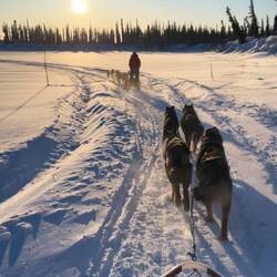 Die Schlittenfahrt ist meist in zwei Teams mit 7 und 8 Hunden eingeteilt, aber manchmal hatten wir auch schon 3 oder 4 Teams mit 3-5 Hunden. In den großen Teams kann auch jeweils eine Person im Schlitten sitzen und dann machen wir eine große 1-2 stündige Tour über mehrere Seen hinweg. Natürlich ist es wichtig immer auf der gleichen Spur zu fahren denn links und rechts bleibt man sonst im Tiefschnee stecken. Als sitzende Person wird einem dann aber extrem kalt, deswegen war es dann besser als ich mein eigenes Team hatte. Das Schlittenfahren sieht einfacher aus als es ist. Anfangs bin ich oft in stärkeren Kurven vom Schlitten geflogen und die Hunde sind auch erst seit ein paar Monaten trainiert und hören deswegen nicht wirklich auf Stop und man muss bremsen. Es passiert auch nicht selten dass sich die Bremse löst und die Hunde einfach ohne Einen fahren. Ansonsten gibt es manchmal Streitereien oder Hunde verheddern sich, doch wenn die ersten paar Minuten überstanden sind kann man größtenteils ohne Probleme fahren.