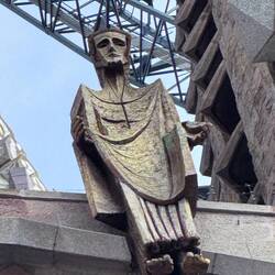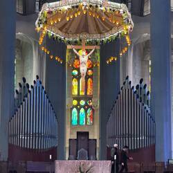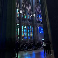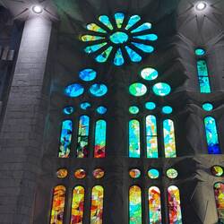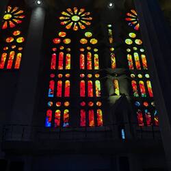 We are in the Basilica of the Sagrada Familia in Barcelona. The most impressive thing when one walks into the building is that all of the stained glass windows on one side are red and yellow, and all of them on the other side are blue and green. The crucifix is unusual. It shows a Jesus not looking down, but rather looking up. I must confess I’m not the biggest fan of Antonio Gaudi, but the colors in the abstract stained glass windows, and his use of soaring space certainly are awe-inspiring.Read more