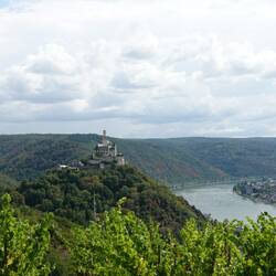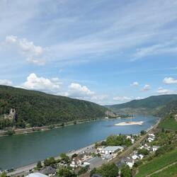 Schöner Blick zurück auf Kaub und die Burgen Pfalzgrafenstein und Gutenfels