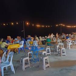 Am Ende der Pier ist ein Bereich mit Tischen und StühlenRead more