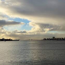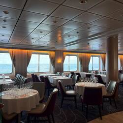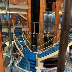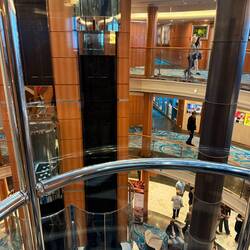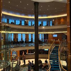 Die Außenbereich des Schiffes sind gesperrt, und als sich versehentlich eine Tür hinter der Absperrung öffnete, hat es uns fast aus der PTE die Treppe hinuntergeweht. Also besser drinnen im Atrium in der Mitte des Schiffes, den Kaffee genossen. Es ist ein sehr schönes Atrium, welches sich mit den klassischen Treppen und Gläsernen Aufzügen über mehrere Decks erstreckt.