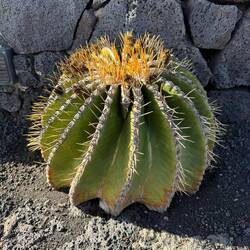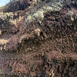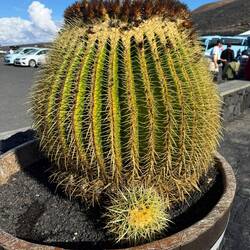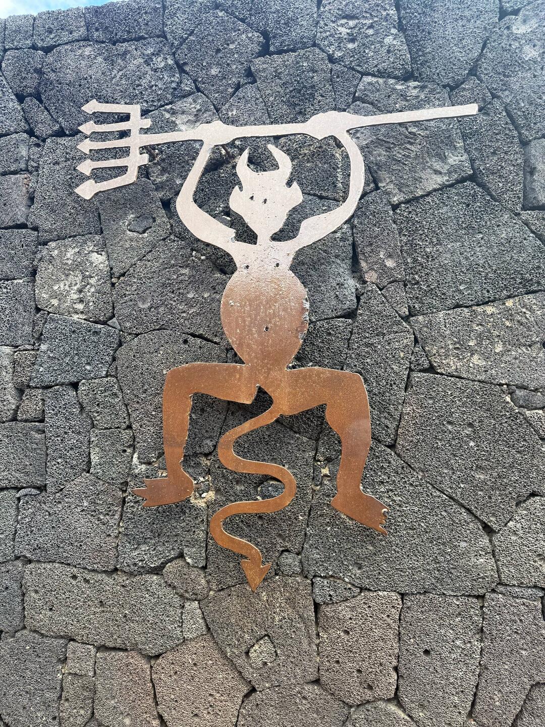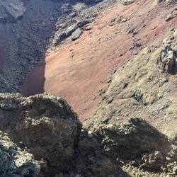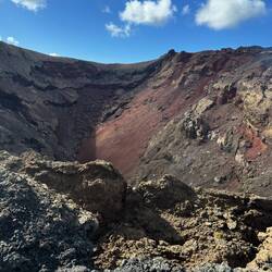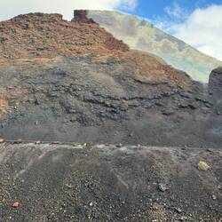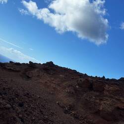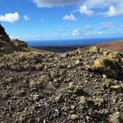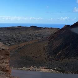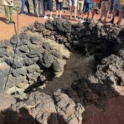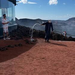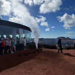 Neben dem Restaurant "El Diabolo" kann man noch einen Blick in den offenen und sehr heißen Schlund riskieren und erleben, wie trockene Aulaga-Büsche (Ginster-Büsche), die in das heiße Erdloch hineingeworfen werden, sofort zu brennen beginnen. Etwas weiter oben schüttet jemand einen Eimer Wasser in ein Erdloch, das in Sekunden als krachende Dampf-Fontaine aus dem Fels in den Himmel gespuckt wird. Beim ersten Mal ist sogar die Mensch zusammengezuckt, obwohl sie wusste, was passiert. Man kann auch die heißen Steine anfassen. Darauf haben wir aber wohlweislich verzichtet – dafür hatten wir ja die Mensch dabei. In 4m Tiefe herrschen hier immerhin noch 400 Grad Celsius, in 12 Metern Tiefe sind es ca. 600 Grad Celsius.