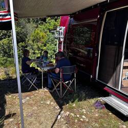 Sello, chapa del lugar y a la piscina. Pero esta vez la tormenta nos atrapa y nos toca rato de furgo.