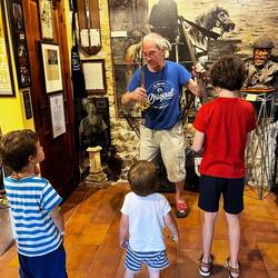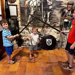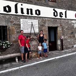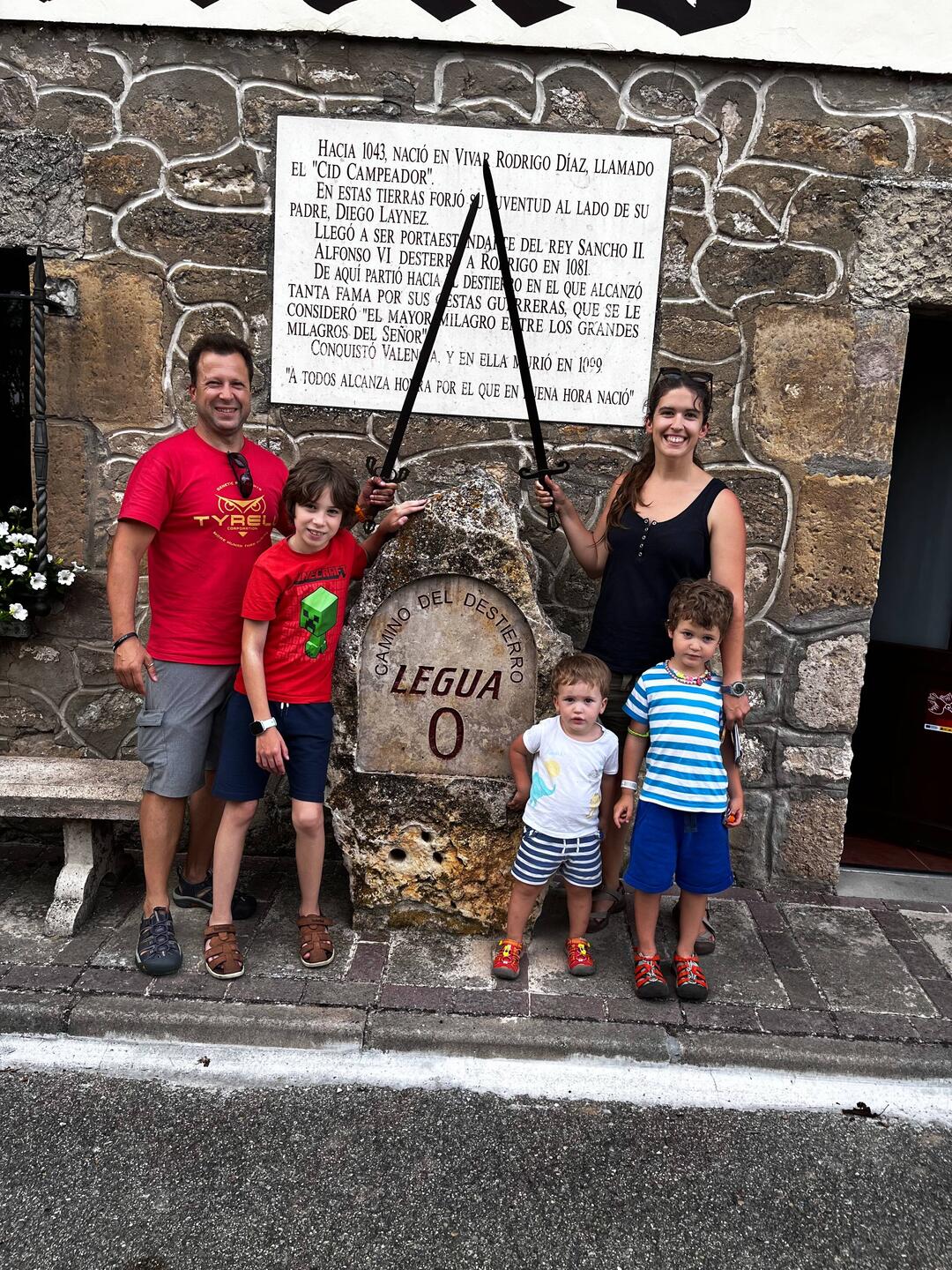 Llegamos tarde pero Javier, el dueño de la legua 0 del camino, nos abre el molino y nos hace a cada uno nuestro salvo conducto. Encantador, insiste en habernos fotos con las espadas. Buen comienzo.