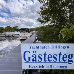 Im Yachthafen Dillingen, den wir um 15:30 Uhr erreichen, gibt es Gastliegeplätze gleich hinter der Einfahrt. Wir sind die einzigen Gäste, Vorsaison. Ein sehr entspanntes Hafenmeister-Ehepaar hilft beim Anlegen; gechillter Checkin im Freien mit Blick auf die Saar. Verkehrslärm - ein Abschnitt der A8 verläuft parallel zur Saar - mischt sich mit Vogelgezwitscher.