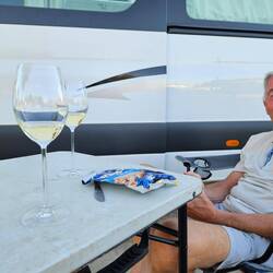 Dr hütig Tag hei mer brucht zum Wäsche und a däm herrliche Strand ds bade. Äs isch heiss gsi bi 34 Grad. Z letschte Apero gniesse mer ohni Wind dusse.