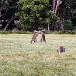 Hüt isch bedeckt gsi u het paar Tröpfli grägnet. Mir si ids Dorf spaziert u hei dert ä hufe Känguruhs gseh. Ou näbem Campingplatz si si gsi. Bim Kafi hei mer is amüsiert über d Papageie. DieRead more