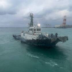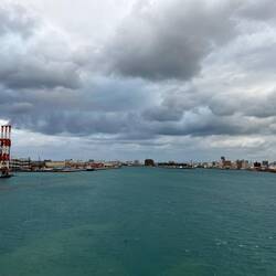Auch hier ist es grau und windig. Aber diesmal haben wir Schlepper, die uns beim Anlegen helfen.