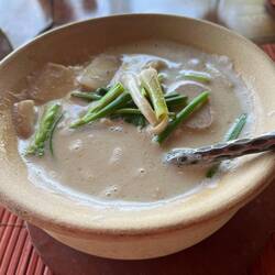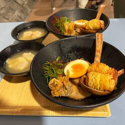 Wir genießen das japanische Mittagessen, besonders die Nudelsuppen. UnsereLeia mais