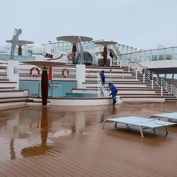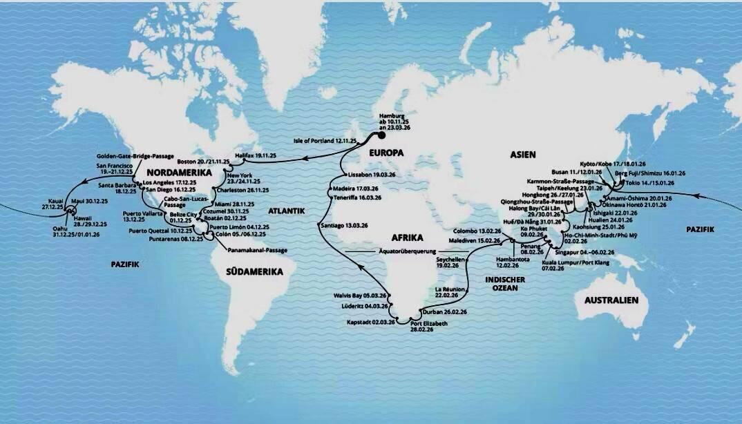 Wir sind 2000 Passagiere an Bord. Für 52% der Reisenden ist es nicht die erste Weltreise. Alles Wiederholungstäter wie wir auch. Es gibt keine Teilstrecken. Alle fahren die komplette Tour.
