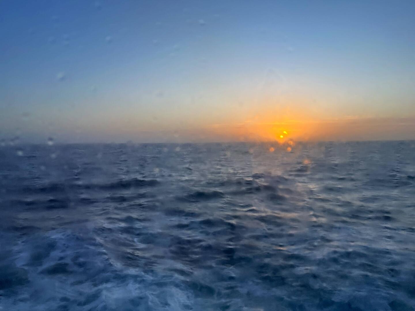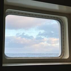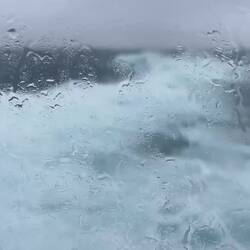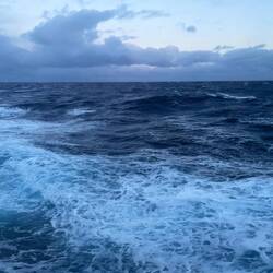 Jetzt auf dem offenen Meer spürt man es deutlich. Die Gischt spritzt an den Fenstern hoch. Wenn man im Bett liegt, ist das Schaukeln ganz gemütlich . Ansonsten gilt, immer eine Hand für das Schiff. Definitiv keine Kaffeefahrt mehr. Spucktütchen liegen bereit . Bleiben wir wohl seetauglich?