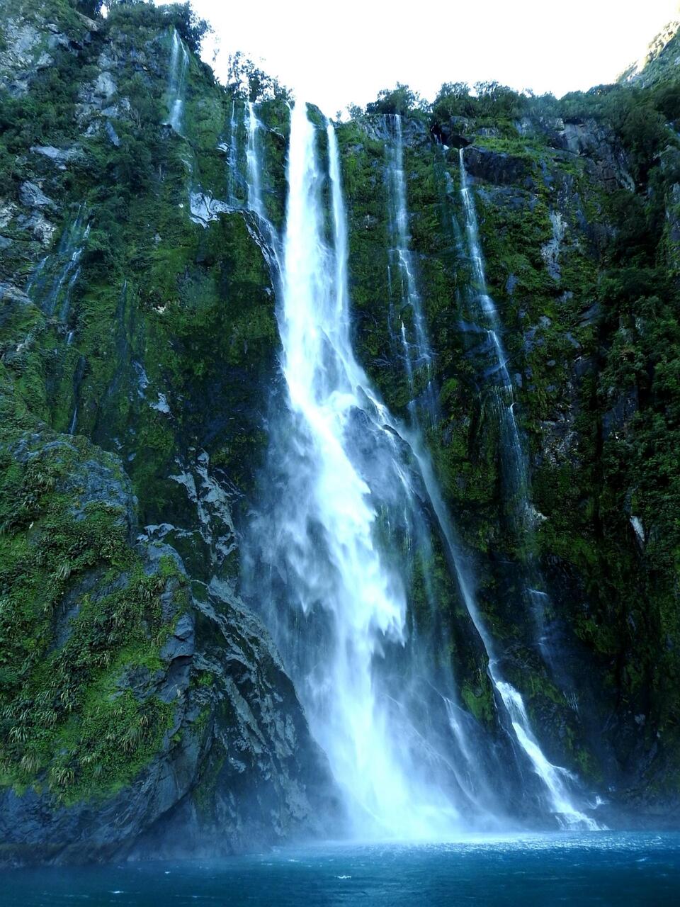 Milford sound was out of this world with its towering fiord's cliffs and mountains and so many waterfalls that cascade downwards from as high as 1000 metres. It was very impressive. The first waterfall was beautiful falling slowly. We got right up close with the front of the boat. We could see a rainbow through it.